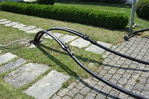 Die Sondenpaare sind mit Y-Stücken an die Sammlerleitung angeschlossen. Deren Durchmesser beträgt 50 mm. Sie läuft 8 m im Erdboden in einer Tiefe von 1.4 bis 1.0 m ans Haus und von dort in den Keller.