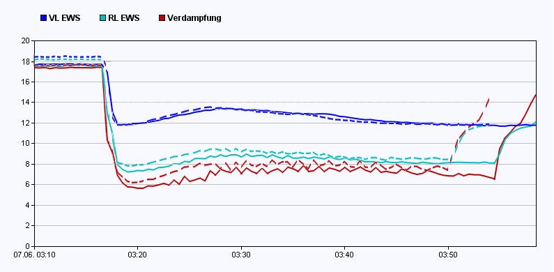 verglichen mit dem 5.6.08 (gestrichelte Kurven) als die Solepumpe bei voller